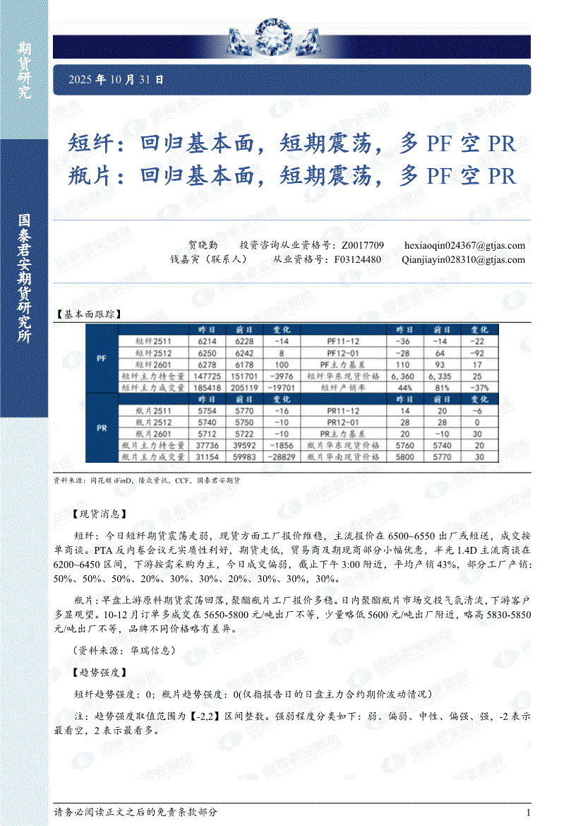 国泰君安期货-短纤:回归基本面,短期震荡,多PF空PR,瓶片,回归基本面,短期震荡,多PF空PR-251031