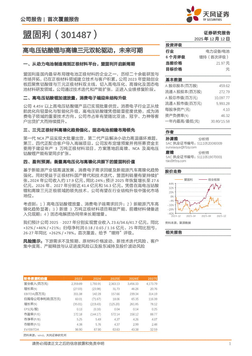 盟固利:天风证券-盟固利-301487-高电压钴酸锂与高镍三元双轮驱动,未来可期-251212