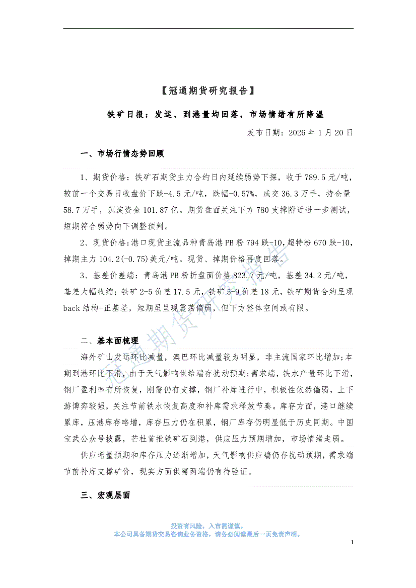 冠通期货-铁矿日报:发运、到港量均回落,市场情绪有所降温-260120