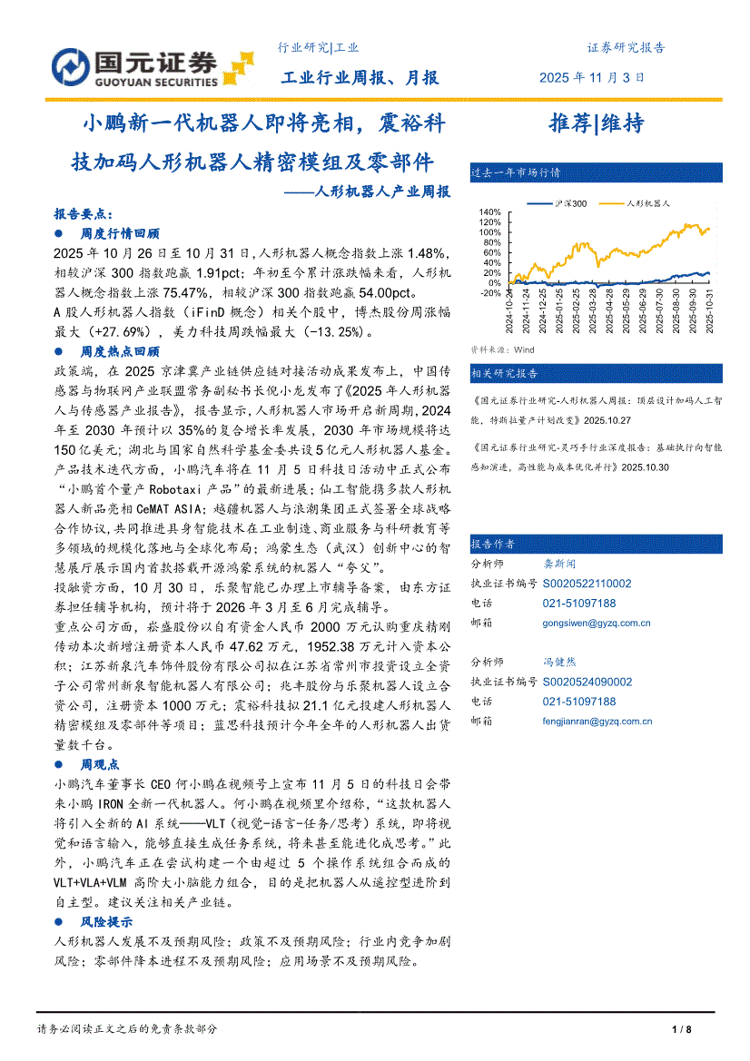 人形机器人行业:国元证券-人形机器人行业产业周报:小鹏新一代机器人即将亮相,震裕科技加码人形机器人精密模组及零部件-251103