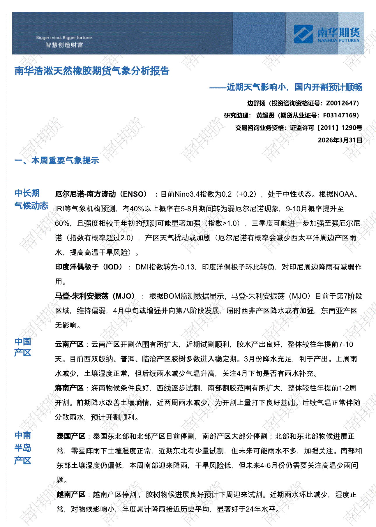 南华期货-南华浩淞天然橡胶期货气象分析报告:近期天气影响小,国内开割预计顺畅-260331