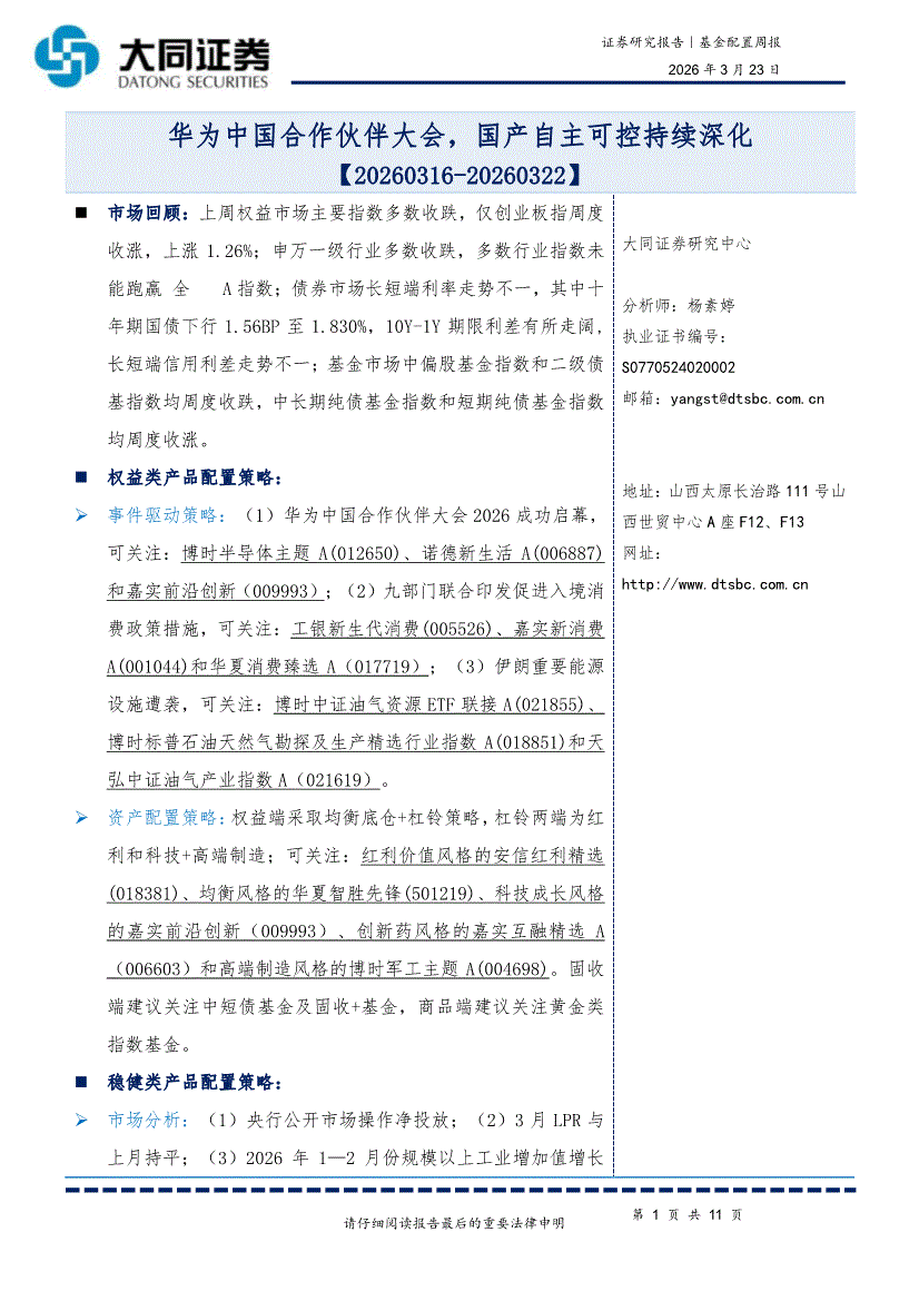 大同证券-基金配置周报:华为中国合作伙伴大会,国产自主可控持续深化-260323