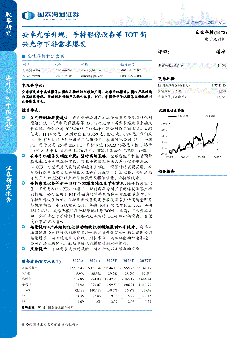 丘钛科技:国泰海通证券-丘钛科技-1478.HK-首次覆盖:安卓光学升规,手持影像设备等IOT新兴光学下游需求爆发-250723
