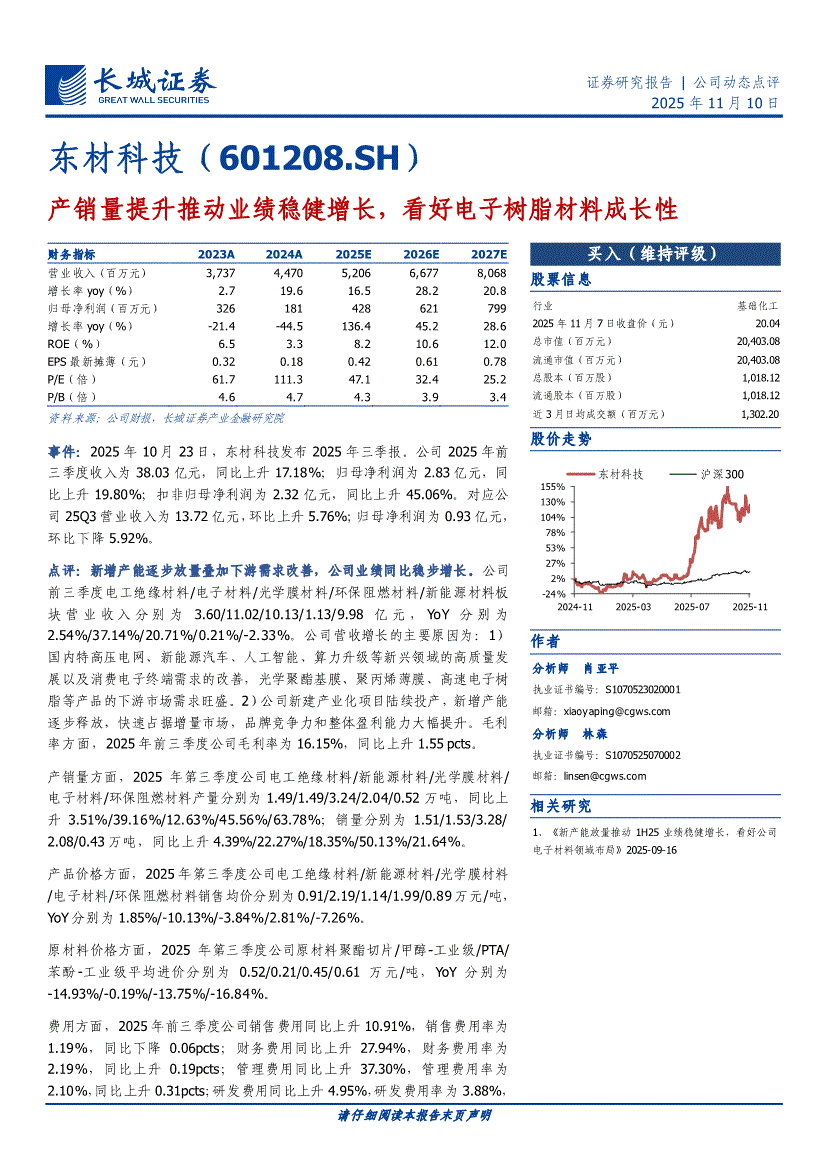 东材科技:长城证券-东材科技-601208-产销量提升推动业绩稳健增长,看好电子树脂材料成长性-251110