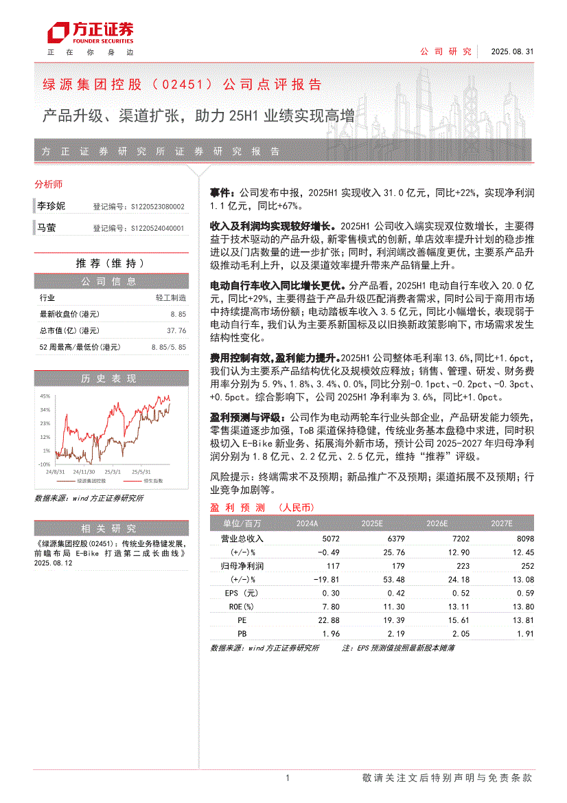 绿源集团控股:方正证券-绿源集团控股-2451.HK-公司点评报告:产品升级、渠道扩张,助力25H1业绩实现高增-250831