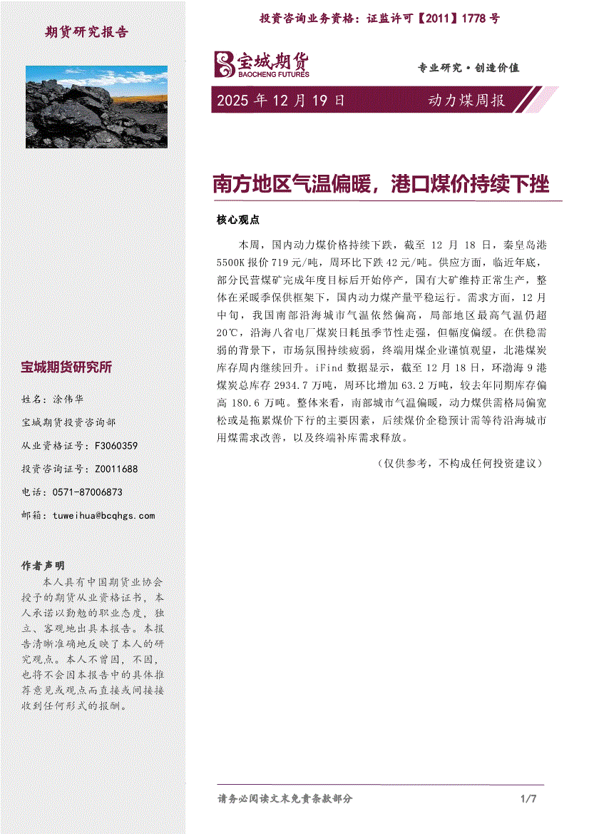 宝城期货-动力煤周报:南方地区气温偏暖,港口煤价持续下挫-251219