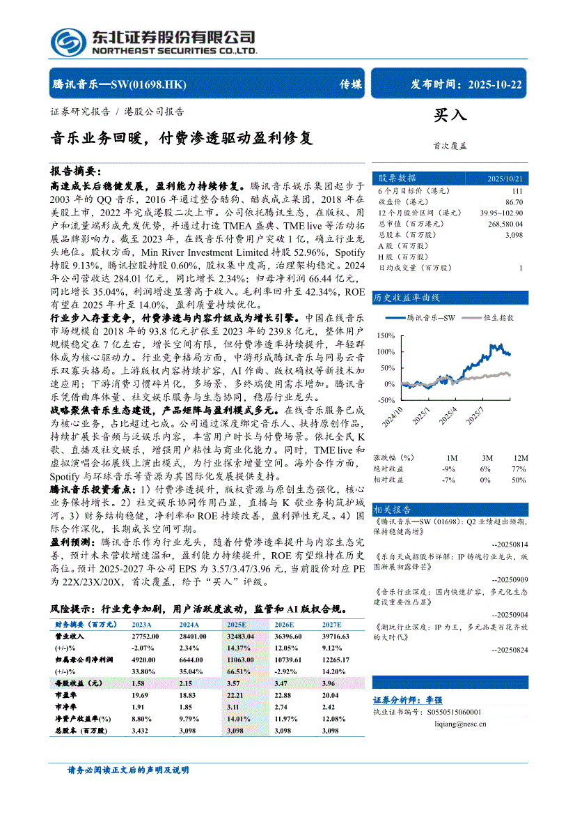 腾讯音乐~SW:东北证券-腾讯音乐~SW-1698.HK-音乐业务回暖,付费渗透驱动盈利修复-251022