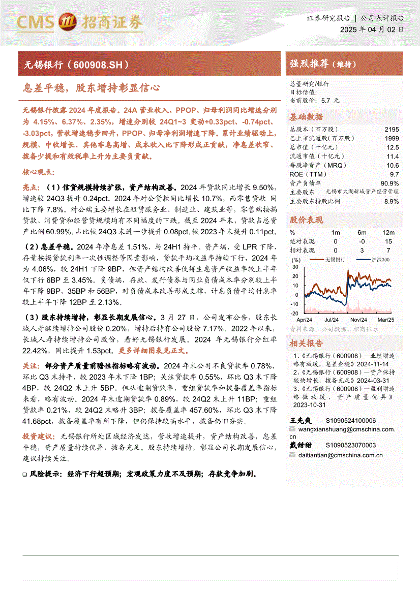 无锡银行:招商证券-无锡银行-600908-息差平稳,股东增持彰显信心-250402