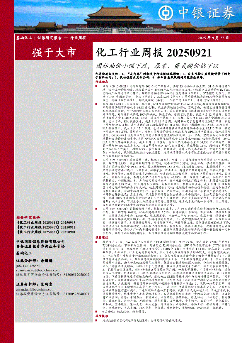 化工行业:中银国际-化工行业周报:国际油价小幅下跌,尿素、蛋氨酸价格下跌-250922