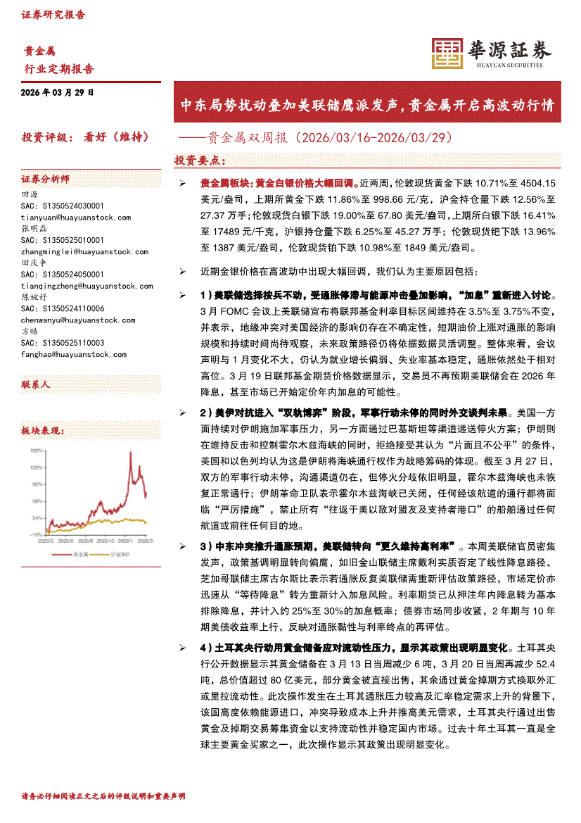 贵金属行业:华源证券-贵金属行业双周报:中东局势扰动叠加美联储鹰派发声,贵金属开启高波动行情-260329