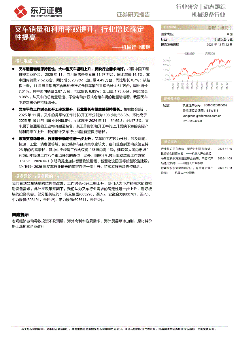 机械行业:东方证券-机械行业跟踪:叉车销量和利用率双提升,行业增长确定性提高-251222
