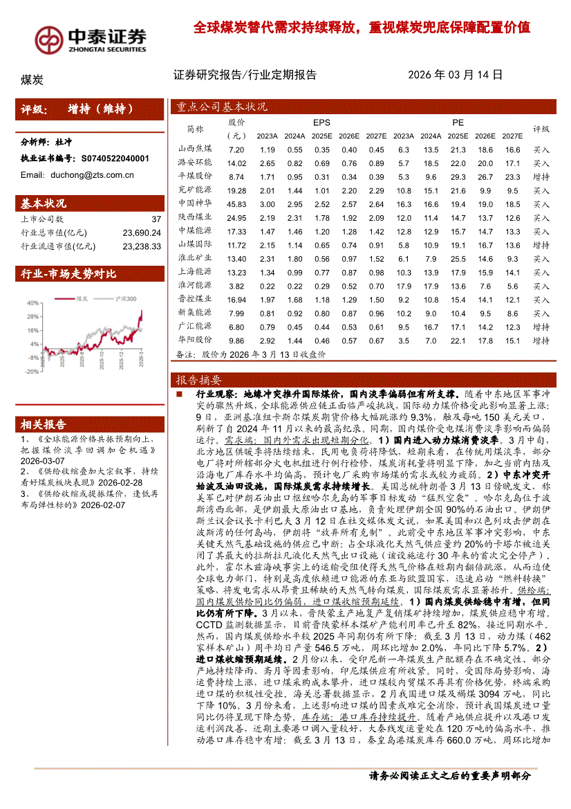 煤炭行业:中泰证券-煤炭行业:全球煤炭替代需求持续释放,重视煤炭兜底保障配置价值-260314
