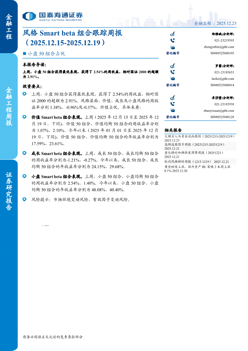 国泰海通证券-风格Smart beta组合跟踪周报:小盘50组合占优-251223