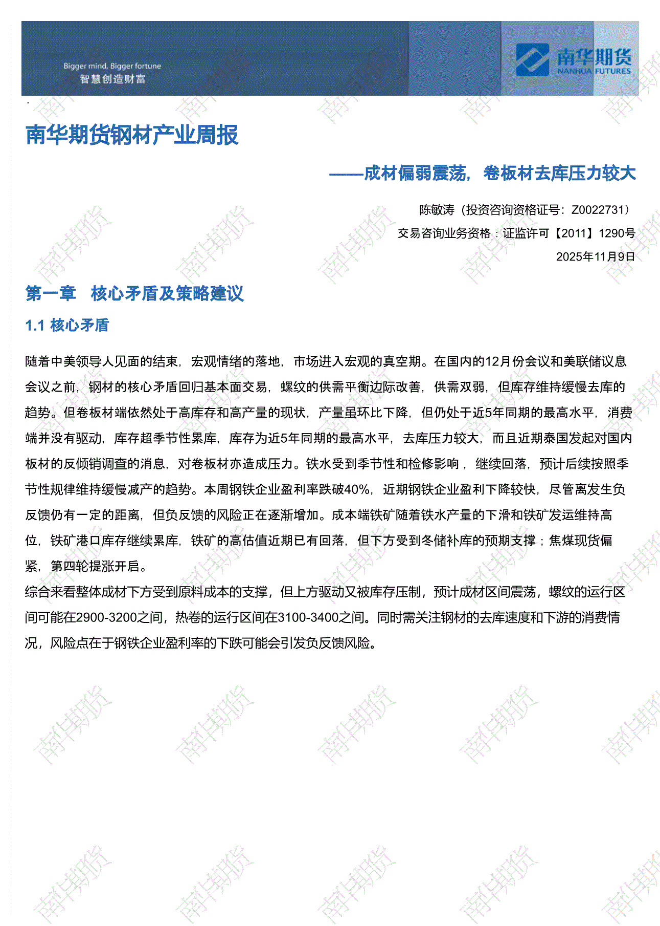 南华期货-钢材产业周报:成材偏弱震荡,卷板材去库压力较大-251109