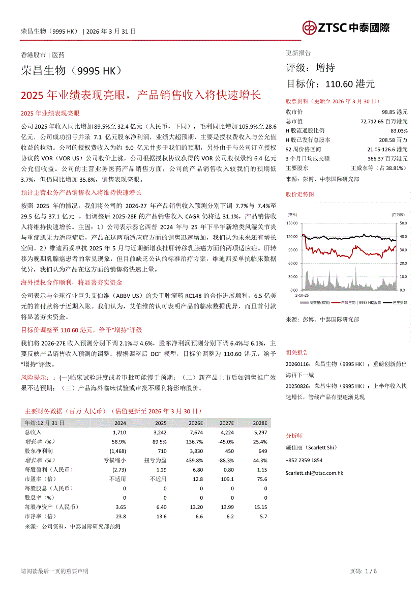 荣昌生物:中泰国际-荣昌生物-9995.HK-2025年业绩表现亮眼,产品销售收入将快速增长-260331