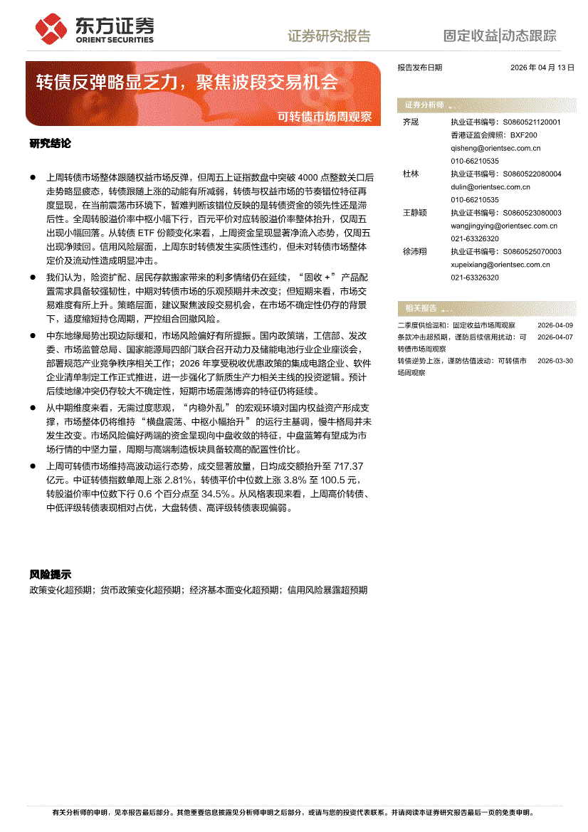 东方证券-可转债市场周观察:转债反弹略显乏力,聚焦波段交易机会-260413