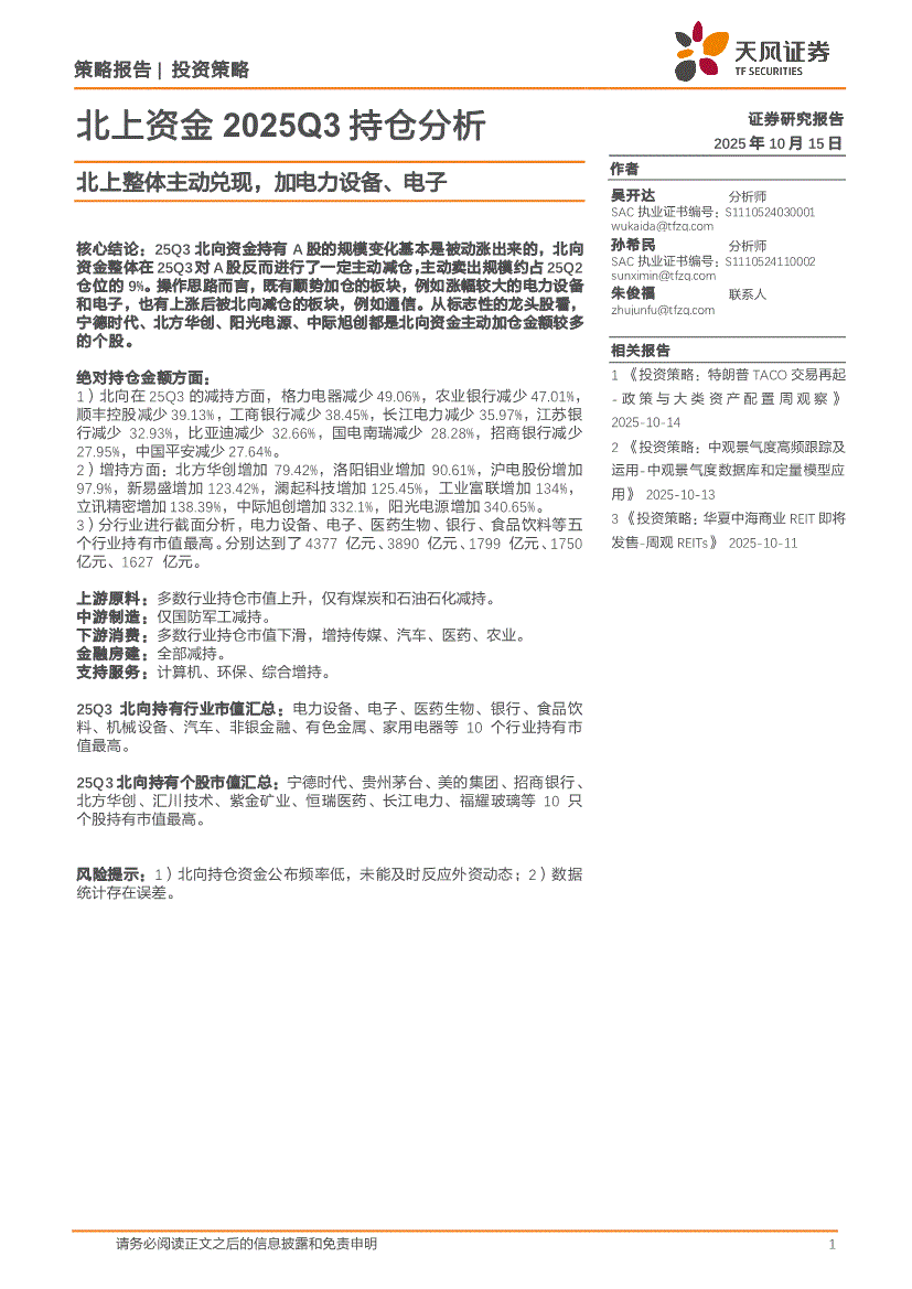天风证券-北上资金2025Q3持仓分析:北上整体主动兑现,加电力设备、电子-251015