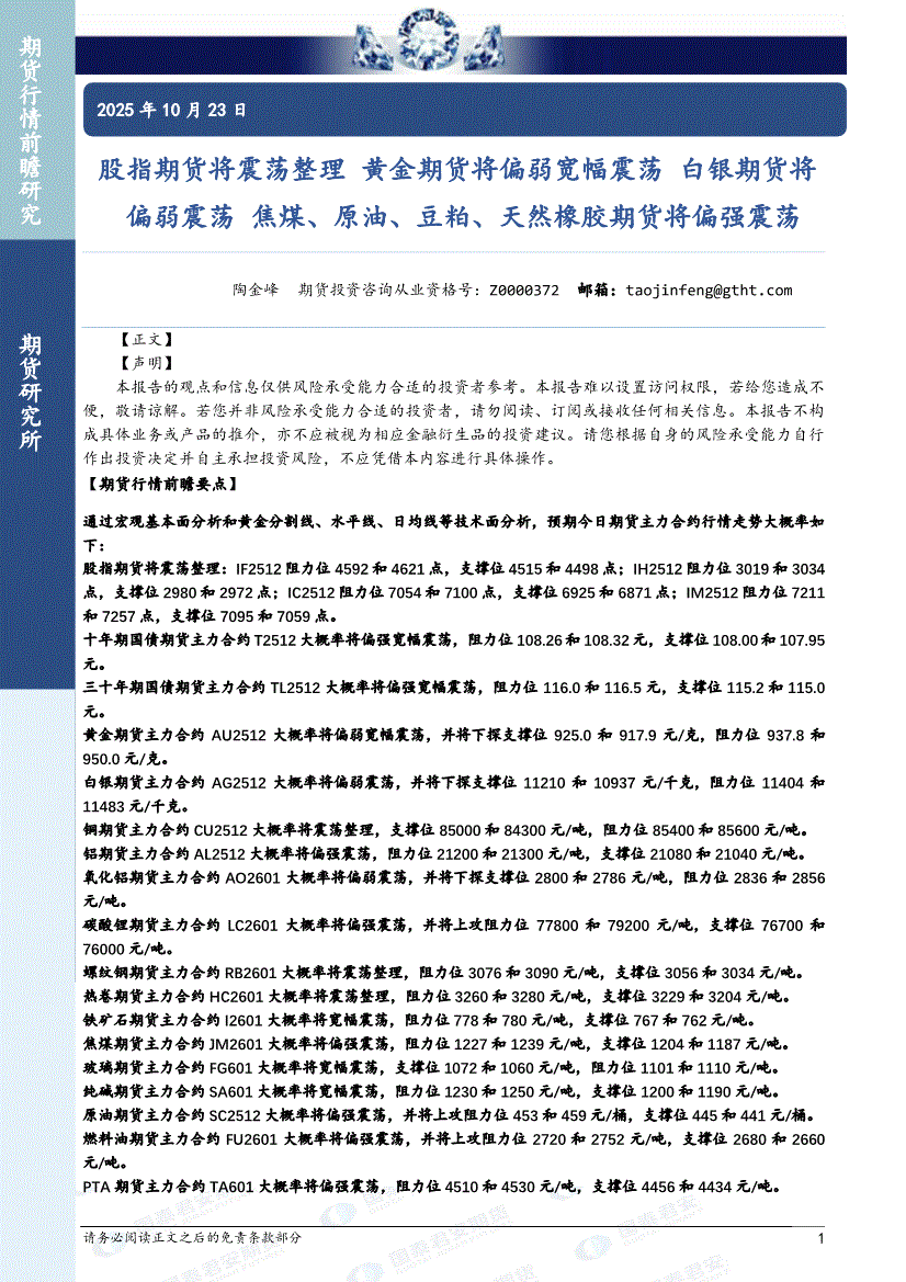 国泰君安期货-股指期货将震荡整理,黄金期货将偏弱宽幅震荡,白银期货将偏弱震荡,焦煤、原油、豆粕、天然橡胶期货将偏强震荡-251023