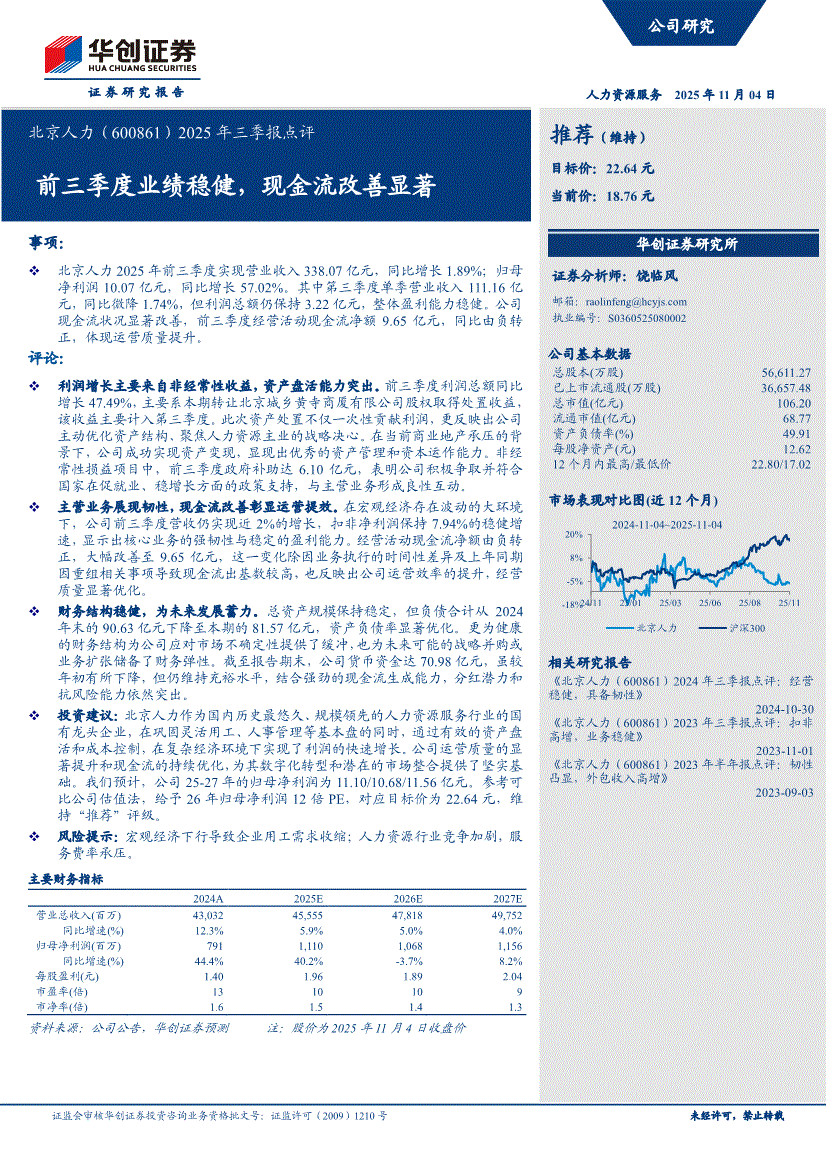 北京人力:华创证券-北京人力-600861-2025年三季报点评:前三季度业绩稳健,现金流改善显著-251104
