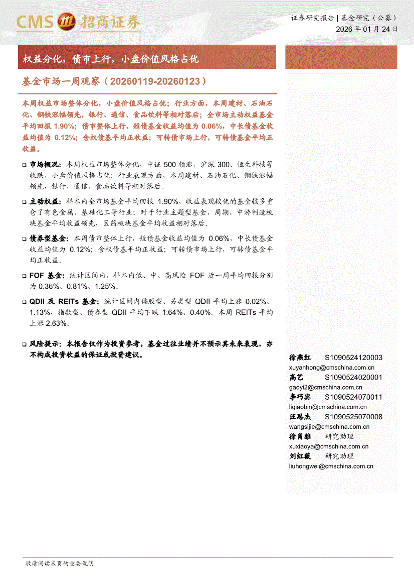 招商证券-基金市场一周观察:权益分化,债市上行,小盘价值风格占优-260124