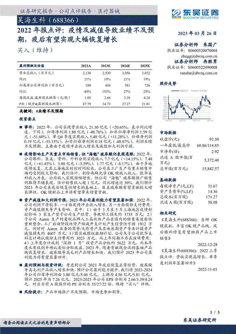昊海生科:东吴证券-昊海生科-688366-2022年报点评:疫情及减值导致业绩不及预期,疫后有望实现大幅恢复增长-230326