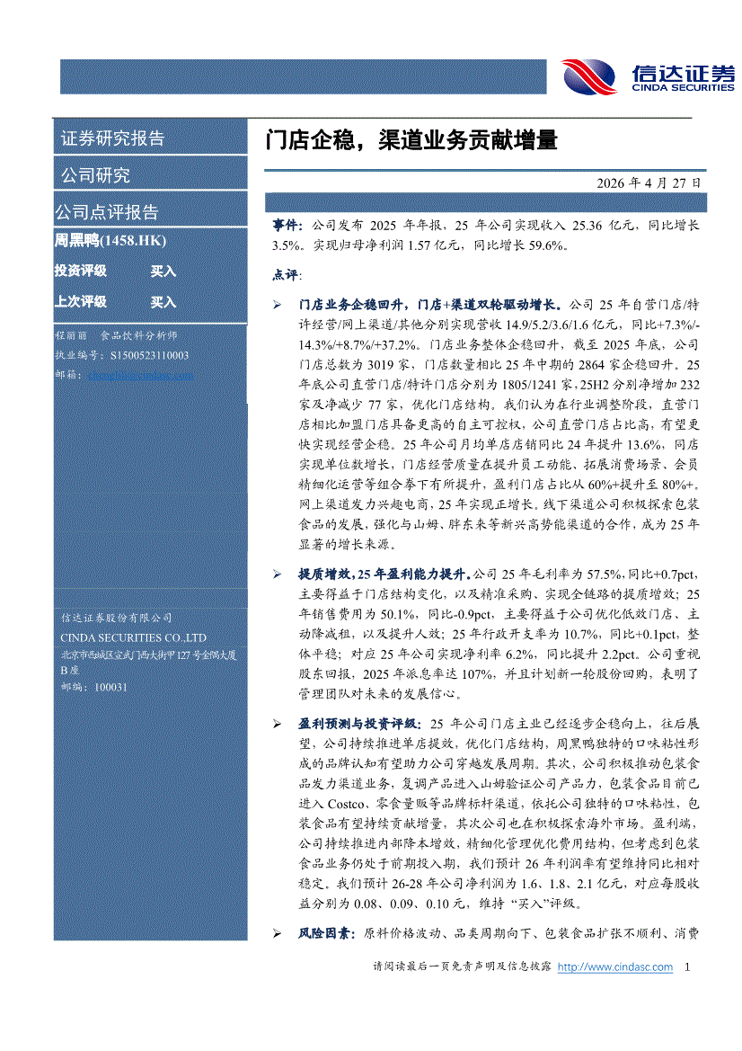 周黑鸭:信达证券-周黑鸭-1458.HK-门店企稳,渠道业务贡献增量-260427