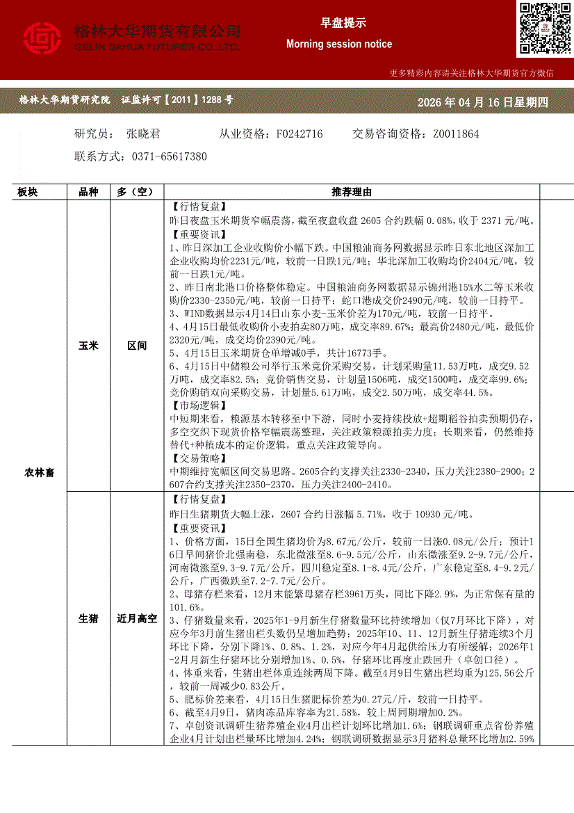 格林大华期货-早盘提示:玉米生猪鸡蛋-260416