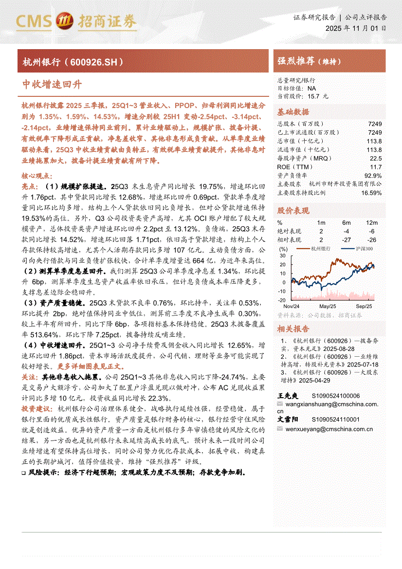 杭州银行:招商证券-杭州银行-600926-中收增速回升-251101