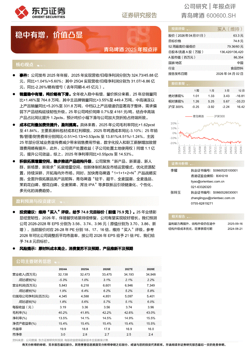 青岛啤酒:东方证券-青岛啤酒-600600-2025年报点评:稳中有增,价值凸显-260402