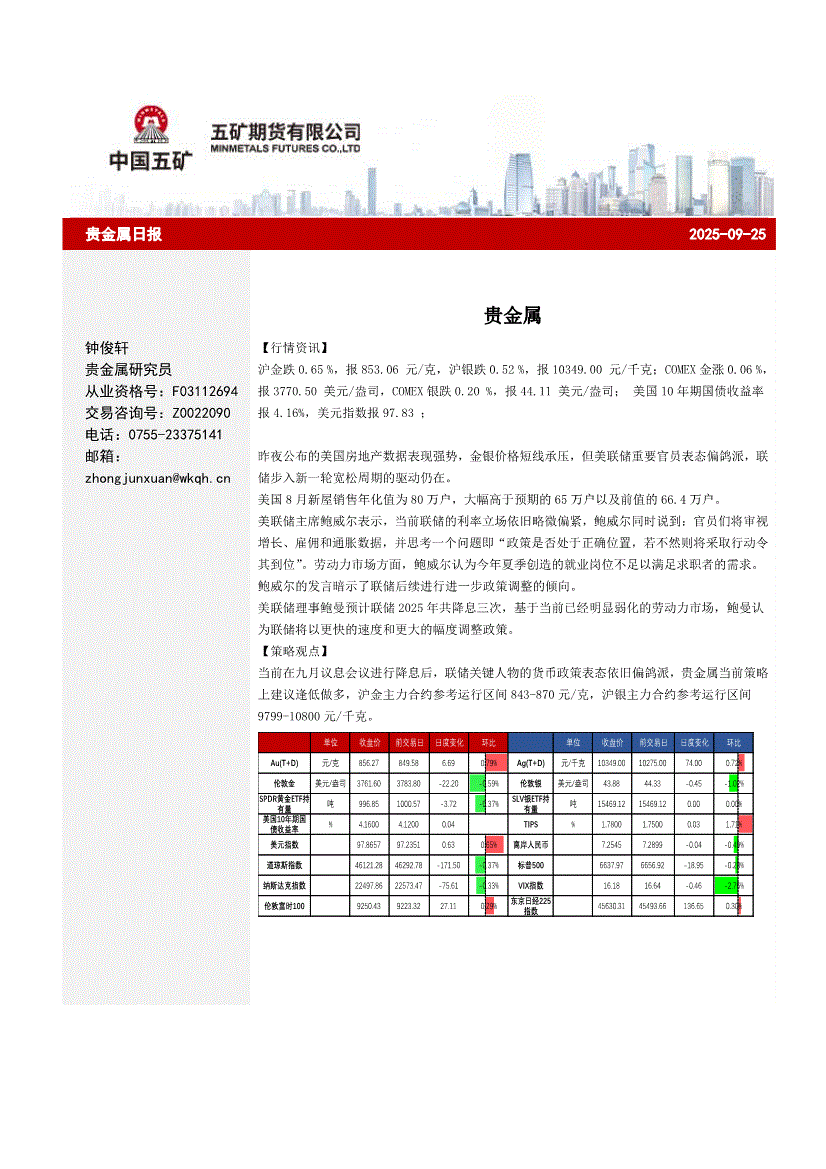五矿期货-贵金属周报:美联储降息周期开启,贵金属价格将持续走强-250920