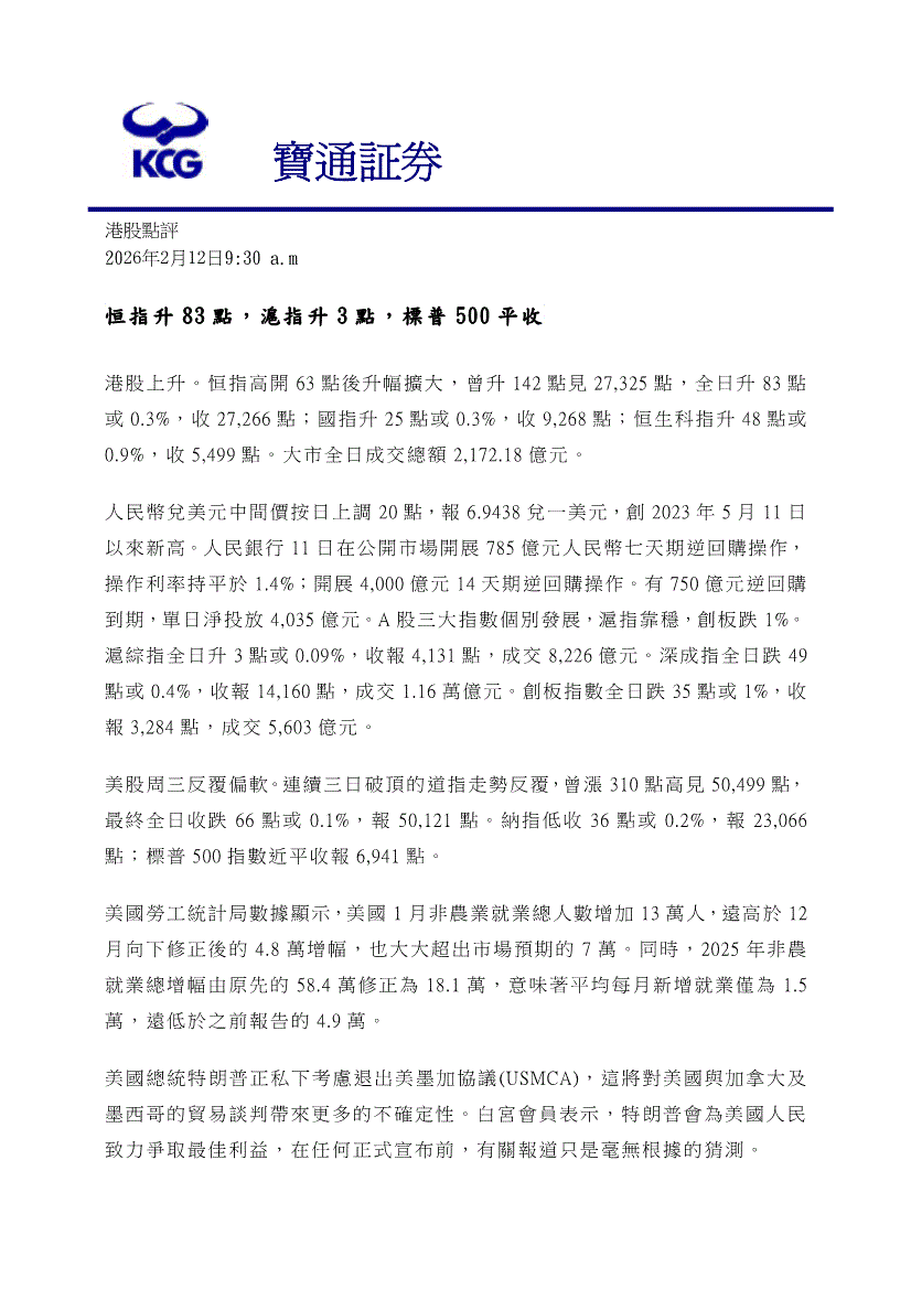 宝通证券-港股点评:恒指升83点,沪指升3点,标普500平收-260212
