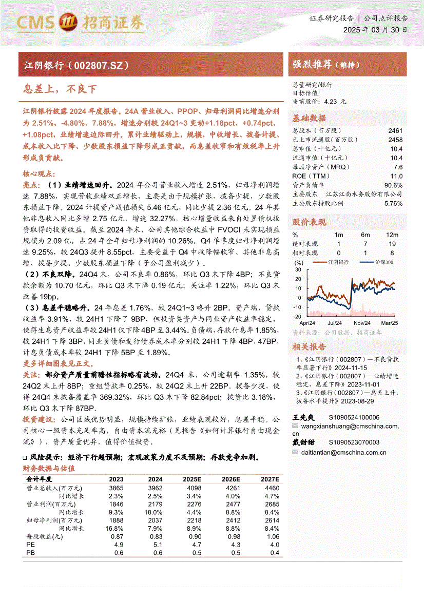 江阴银行:招商证券-江阴银行-002807-息差上,不良下-250330