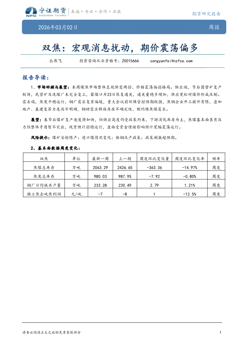 宁证期货-双焦周报:宏观消息扰动,期价震荡偏多-260302