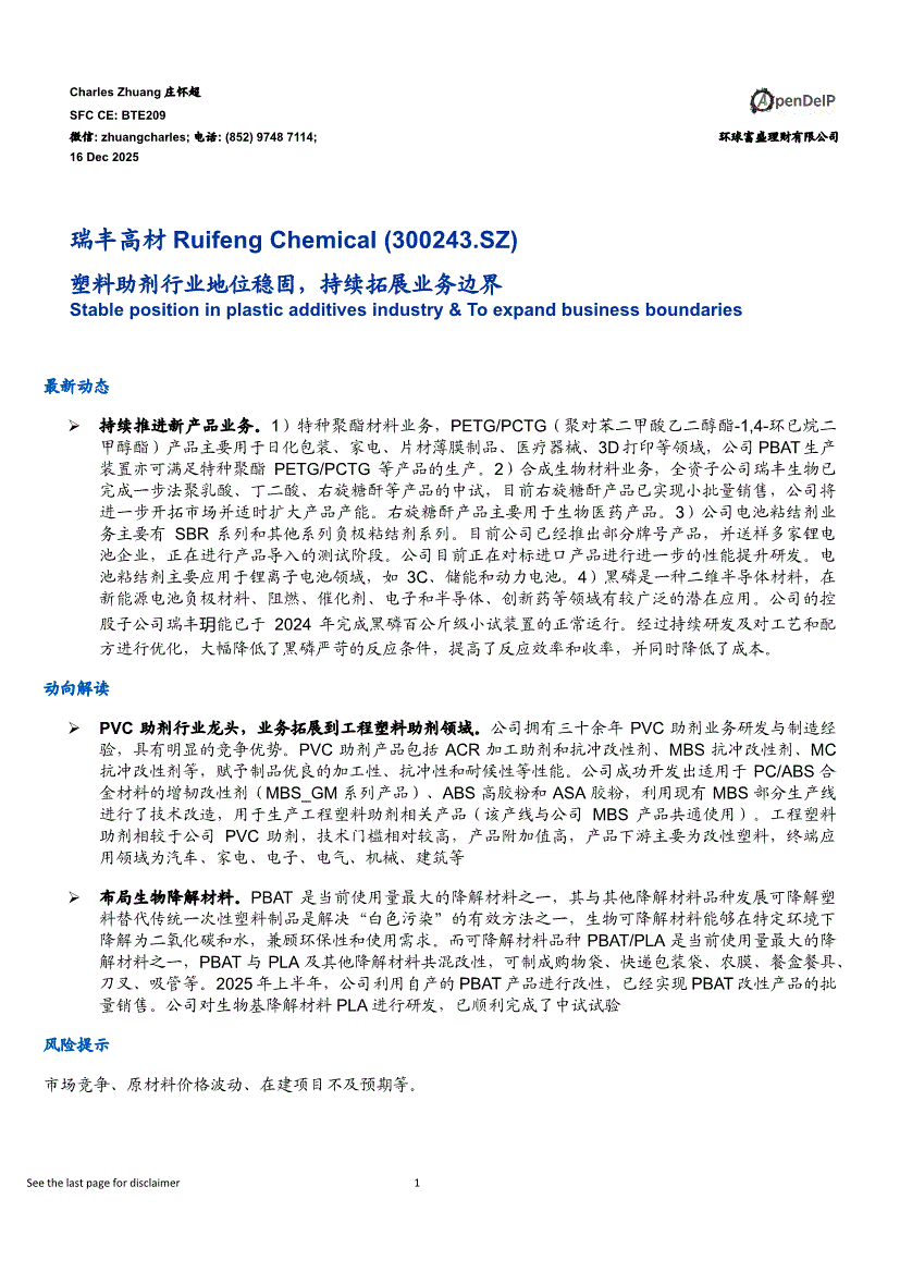 瑞丰高材:环球富盛-瑞丰高材-300243-塑料助剂行业地位稳固,持续拓展业务边界-251216