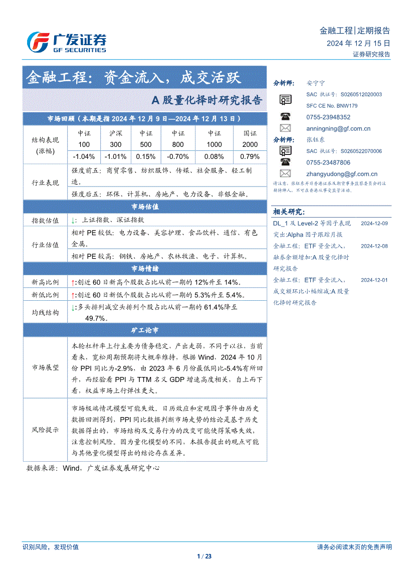广发证券-A股量化择时研究报告:金融工程,资金流入,成交活跃-241215