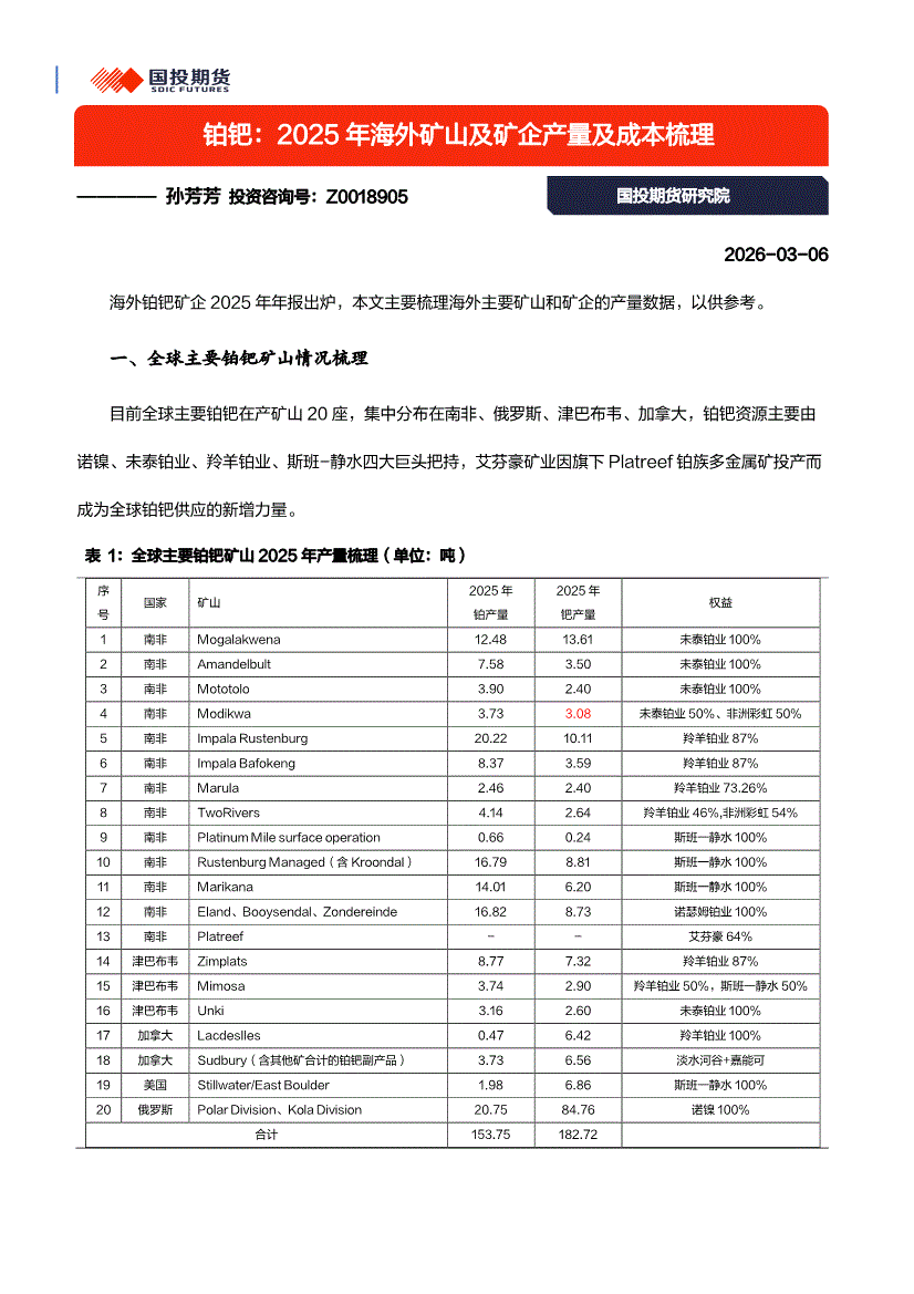 国投期货-铂钯:2025年海外矿山及矿企产量及成本梳理-260306