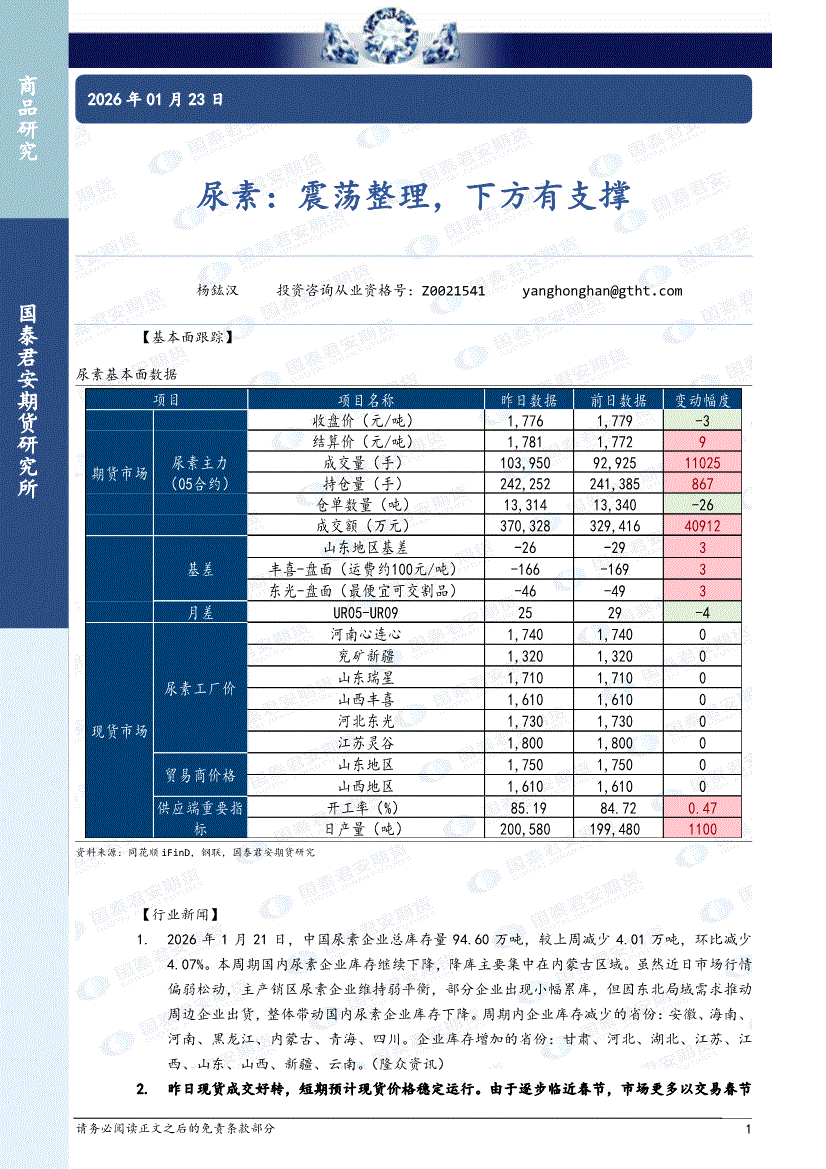 国泰君安期货-尿素:震荡整理,下方有支撑-260122
