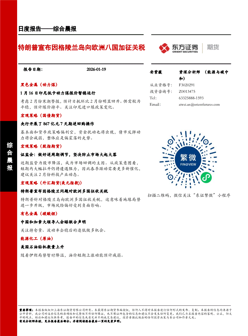 东证期货-综合晨报:特朗普宣布因格陵兰岛向欧洲八国加征关税-260119