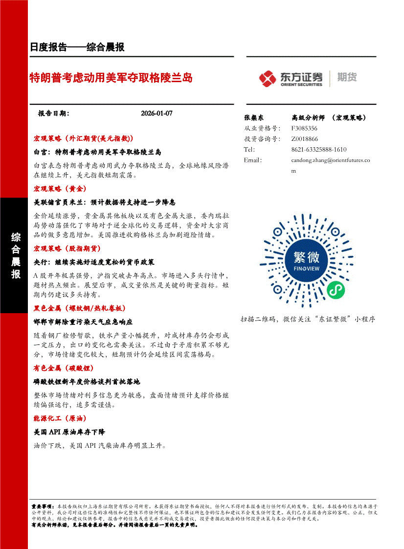 东证期货-综合晨报:特朗普考虑动用美军夺取格陵兰岛-260107