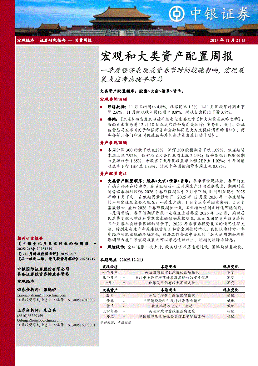 中银国际-宏观和大类资产配置周报:一季度经济表现或受春节时间较晚影响,宏观政策或应考虑提早布局-251221