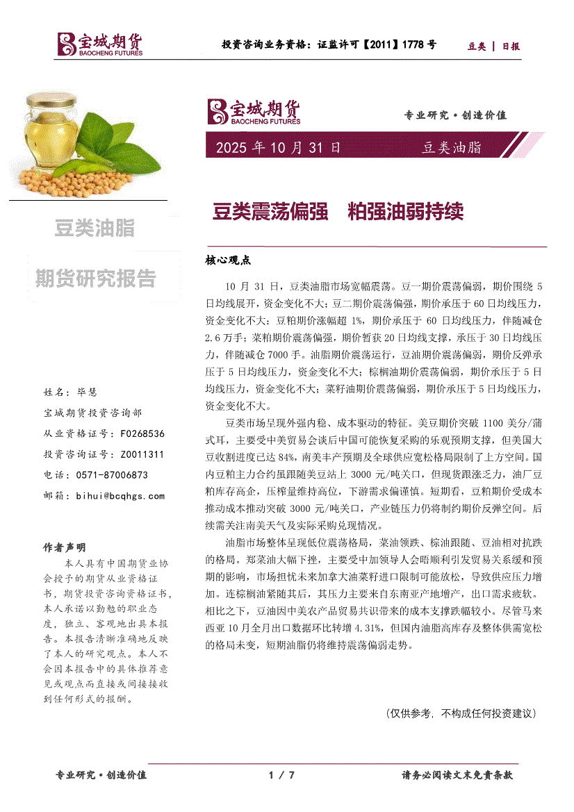 宝城期货-豆类油脂日报:豆类震荡偏强,粕强油弱持续-251031