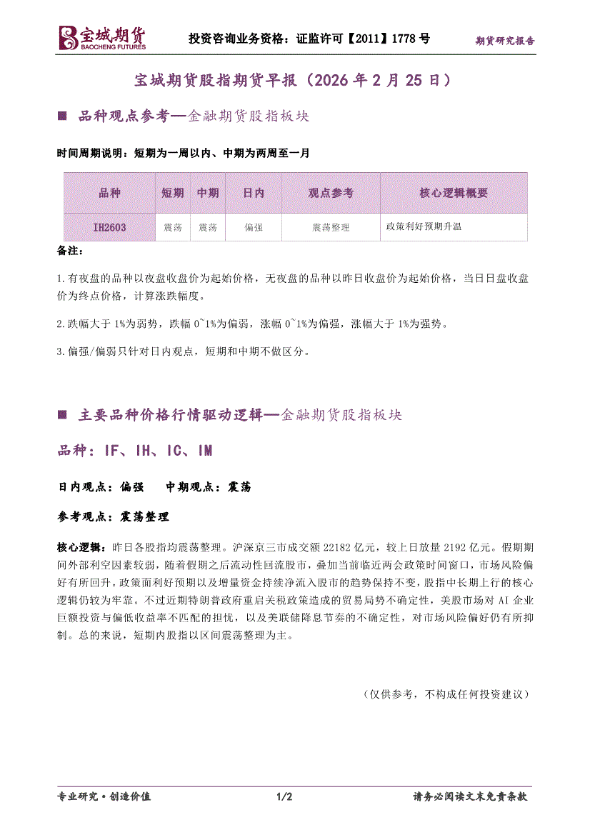 宝城期货-股指衍生品周报:预计股指震荡偏强运行-260223