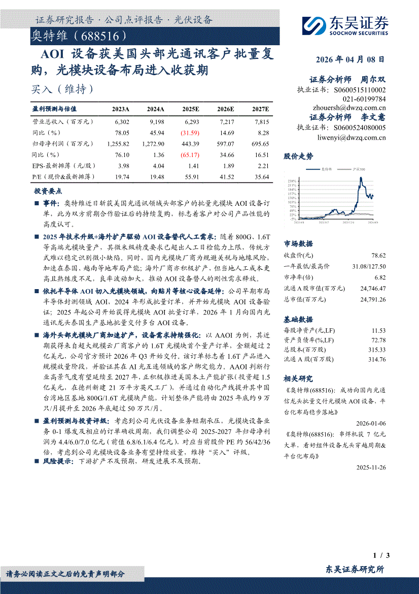 奥特维:东吴证券-奥特维-688516-AOI设备获美国头部光通讯客户批量复购,光模块设备布局进入收获期-260408