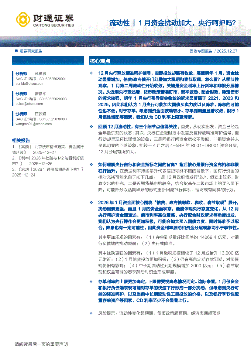 财通证券-流动性|1月资金扰动加大,央行呵护吗?-251227