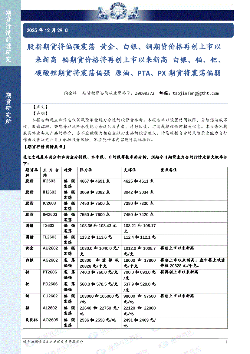 国泰君安期货-股指期货将偏强震荡,黄金、白银、铜期货价格再创上市以来新高,铂期货价格将再创上市以来新高,白银、铂、钯、碳酸锂期货将震荡偏强,原油、PTA、PX期货将震荡偏弱-251229