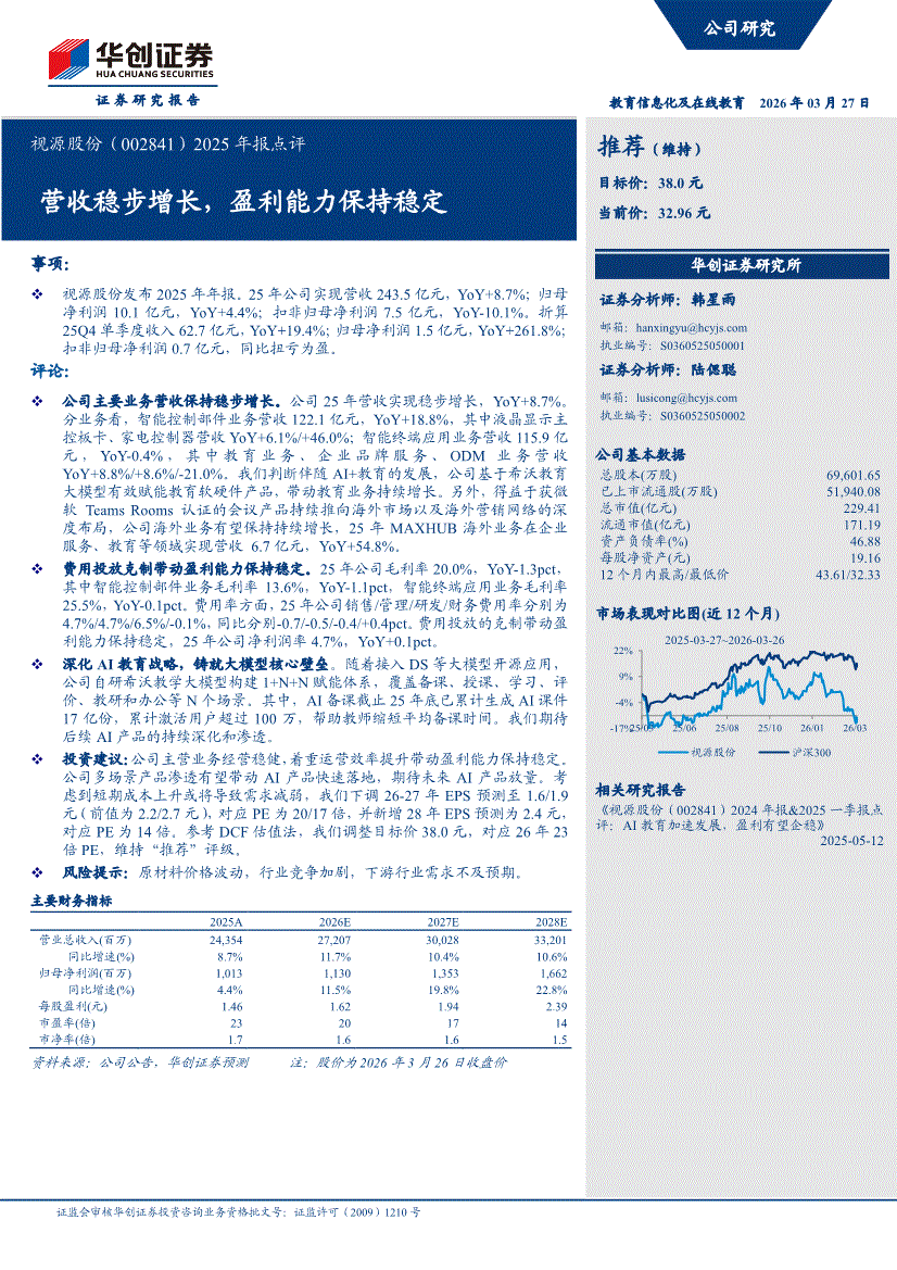 视源股份:华创证券-视源股份-002841-2025年报点评:营收稳步增长,盈利能力保持稳定-260327