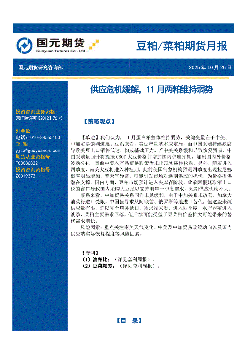 国元期货-豆粕/菜粕期货月报:供应危机缓解,11月两粕维持弱势-251026