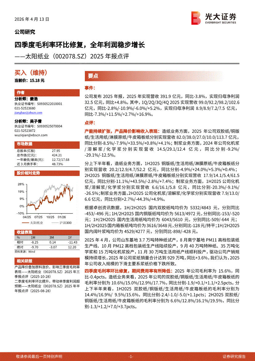 太阳纸业:光大证券-太阳纸业-002078-2025年报点评:四季度毛利率环比修复,全年利润稳步增长-260413
