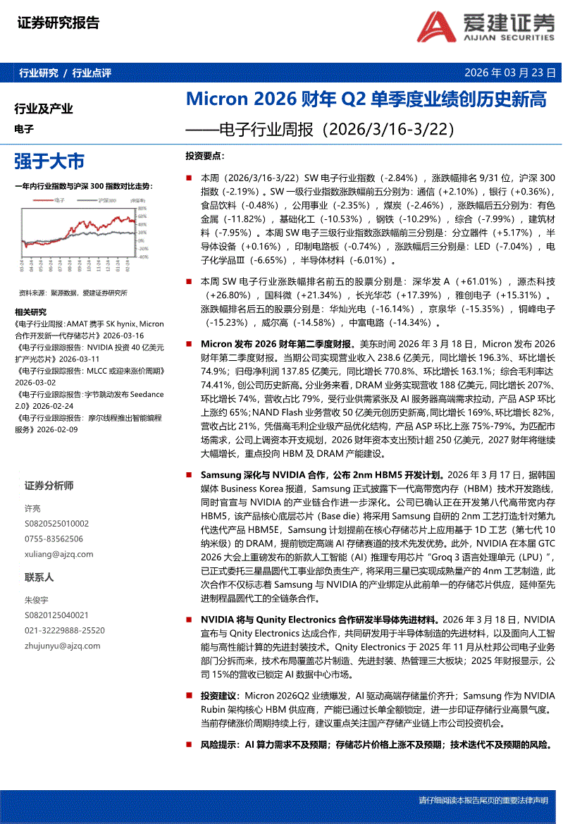 电子行业:爱建证券-电子行业周报:Micron 2026财年Q2单季度业绩创历史新高-260323