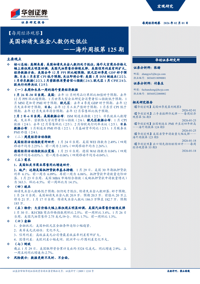 华创证券-【每周经济观察】海外周报第125期:美国初请失业金人数仍处低位-260201